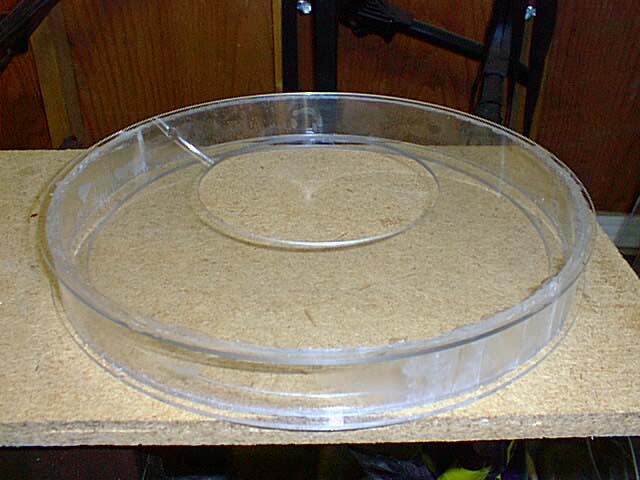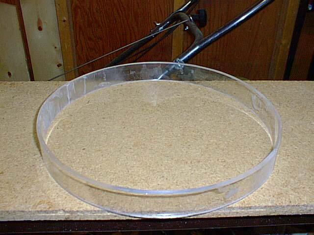 To make the 1-1/4" high center ring for the bottom section, I cut two long strips out of 1/8" acrylic and fashioned a circular wooden form 12-1/8" in diameter. Then I heated the first strip in the oven at 275 degrees for a minute or two, bent it around the form and glued the ends with Weld-On #16. After the first strip had set, I heated and formed the second strip around the first. I then clamped the strips and worked my way around the circle using Weld-On #4 to fuse the strips together. When I reached the end I found that I had a slight gap, so I mixed a slurry of acrylic shavings with Weld-On #4 and used that to fill the gap. | |
