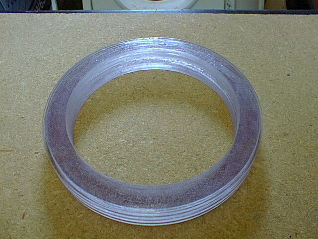 | I had a little sanding to do after the solvent dried on the center ring (that Weld-On runs freely), but I ended up with a fairly round ring, 1/4" thick with an outside diameter of 12-3/8". Then I attached the top and bottom plates with Weld-On #16, one at a time, and clamped them to dry. | ||