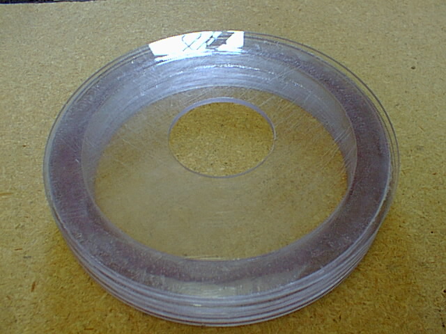 | I found a bin full of scrap plexiglass at a local surplus store, and stocked up on 1/8" sections. I used a Rotozip with the circle cutting attachment to cut out 10 discs, 5 each of 6-7/8" and 7-1/8". In order to do the final sizing and sanding, I modified my Craftsman Disc/Belt Sander by drilling and tapping a 6-32 hole in the shaft. I then stacked up each set of 5 discs and bolted them to the shaft, fired up the sander and used a double-cut mill file (for plastics) and progressively finer sandpaper to cut the discs down to size and sand them. Back to the Rotozip again to cut out the center of the discs, to leave a hollow 5-1/2" interior. Then, the stack is ready to be glued with Weld-On #4 (acrylic solvent). | ||