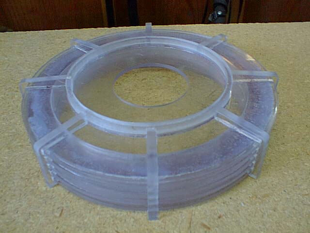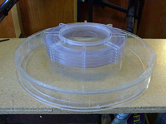 for the center a bit longer, as they ended up with some stress cracks. The other thing I learned about acrylic is, that 1/8" acrylic does not necessarily measure 1/8". The stuff I found is close, but slightly smaller. The biggest effect this discrepancy had was on the small center ring on top of the stack. Because the 1/4" and 1/8" pieces I welded together didn't quite add up to 3/8", I had to modify the vanes a bit so they wouldn't go all the way up to the top of the ring. After I had run out of the media I used to cut the discs for the stack, I found some different stuff for the large discs for the lower section. To my dismay, this new stock cut VERY badly with the Rotozip, with large chips all around the edges. I finally found some more acrylic similar to what I had used for the small discs, which cut much smoother. | ||
