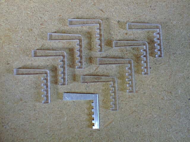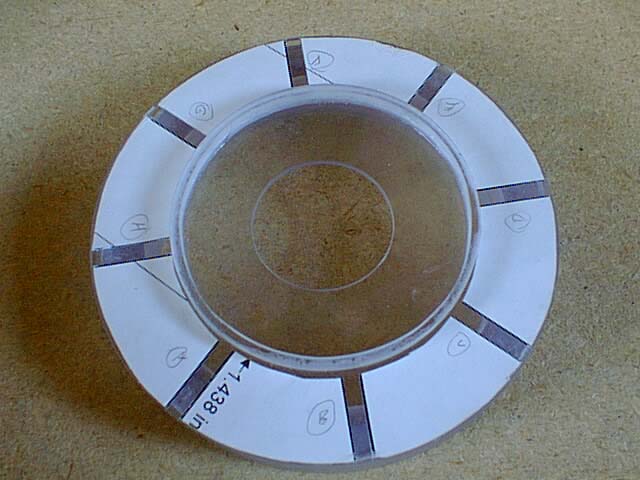 | Despite my best efforts at keeping things centered I ended up with some variation, and the vanes for the top of the stack had to be individually fitted. I scanned the top of the stack from Dave Painter's blueprints, printed the image on removeable label media and stuck it to the top as an alignment guide. The 8 vanes were cut from 1/4" acrylic, each one traced from an 1/8" aluminum template that I cut. The slots were started with a Dremel tool with a medium size ball cutter, and finished off with a bastard file. I opted for rounded edges on the vanes, as that seems to fit better with most of the screen captures I've seen. Finally, the vanes were attached to the stack with Weld-On #16. | ||