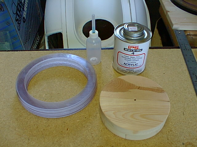 | To keep the discs centered, I cut two 5-1/2" wooden discs, sized and sanded them and glued them together. It was then easy to slide each disc on the stack, smear it with Weld-On #4 and drop the next disc on. I also ran the needle around the edge of each disc so that capillary action distributed more solvent between the discs. Finally, I cut a 2" hole in the center of the top disc and welded it to the stack. | ||
